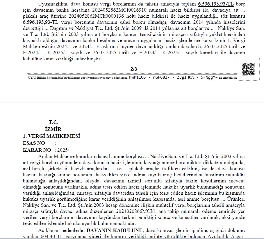 Örneğin vergi davası ile kaldırdığımız – sildirdiğimiz yüklü miktardaki vergi borcuna dair karar: