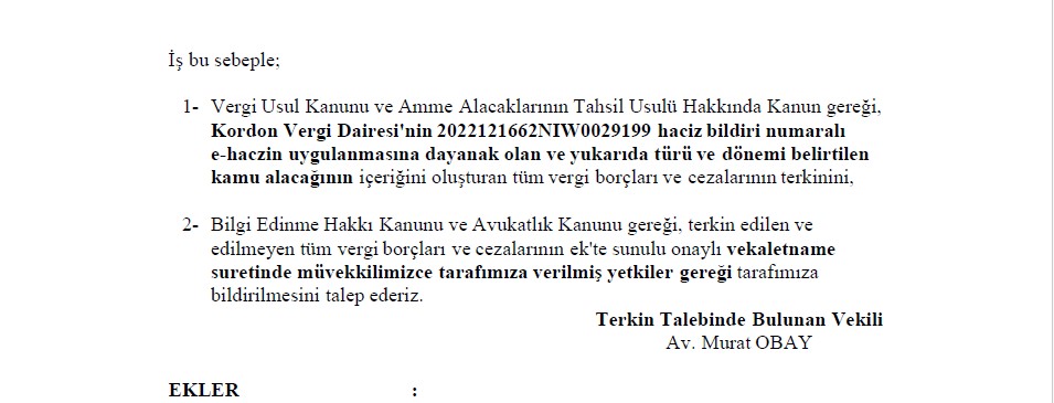 Örneğin gerçekleştirdiğimiz bir vergi borcunun kaldırılması başvurusu: